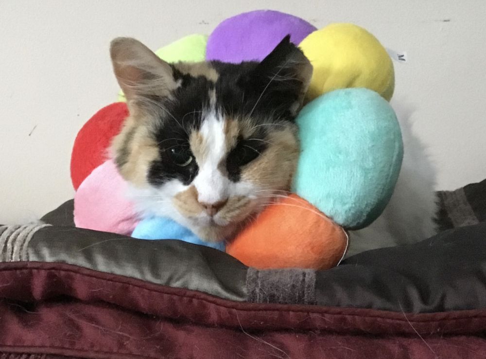 Callie是一年前2/25/2022被送来我家寄养的。在开始的几个月里,Callie的皮肤病会反复出现,牠总是神经质的不停地舔自己的毛发,常常会咬自己的毛发拽自己的毛发。牠时常会呕吐,多半是因为舔进肚里的毛发引起的,也常常呕吐白沫,带牠去看了兽医,兽医说,牠的状况是因为焦虑紧张等精神因素造成的,给了牠一个月的Amitriptyline(antidepressant)。给牠带了一个conecollar,阻止[
