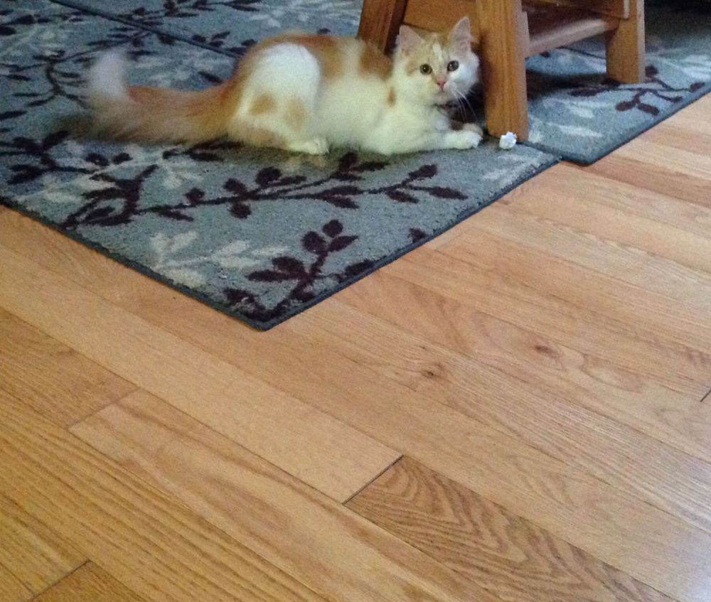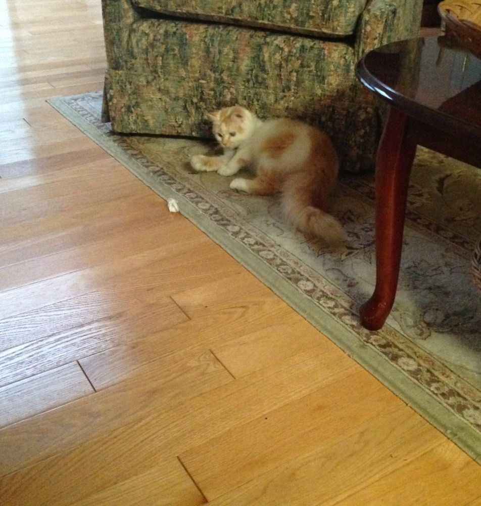 5/5/2020,周二,第八天。继续与Sally玩小纸团和玩具。今天它玩的有点疯,会找好位置等着我扔小纸团,会追着滚动的小纸团,把追到的纸团叼在嘴里跑。如果我在看东西忘了扔玩具,它会跑到我边上来看着我:你怎么啦?怎么不扔纸团啦?还会扑小玩具,好像在扑小老鼠一样,在客厅里疯跑,小猫的本性完全显露出来了,会在我面前很放松的清理自己,还会跑到我跟前来闻闻我的拖鞋,然后赶快离开。