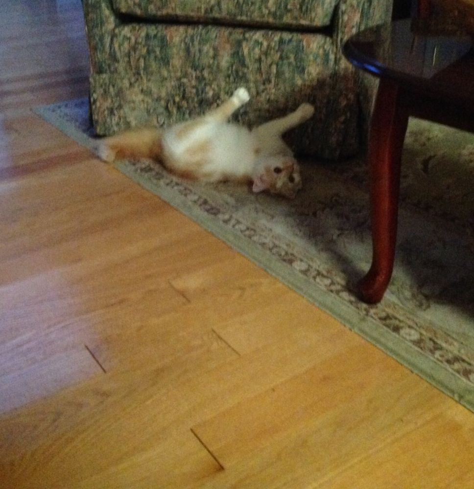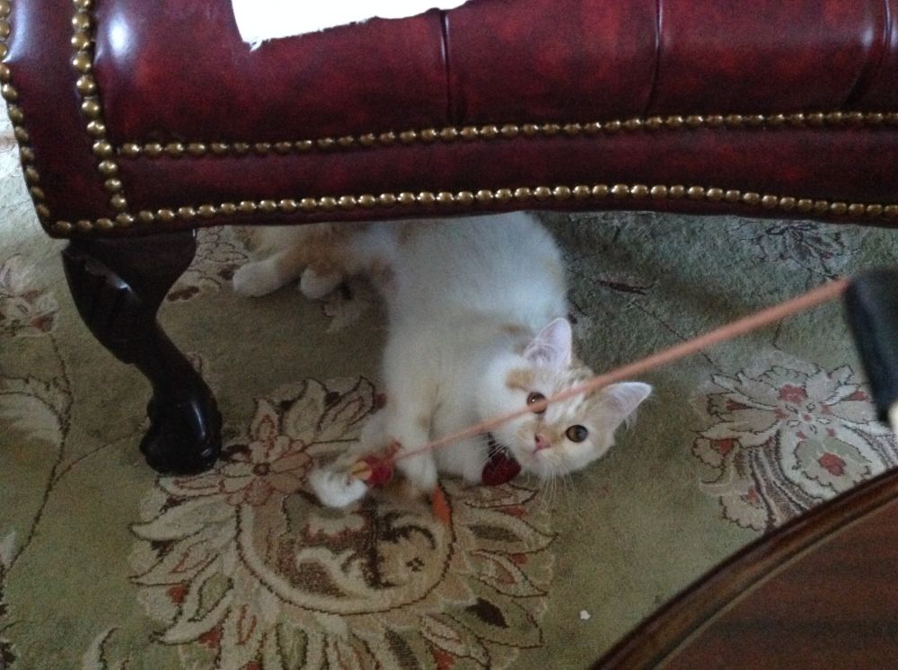 5/3/2020,周日,第六天。Sally 胆子非常小,不喜欢声音,电视开着也会让它紧张。来我家这些天没听见它发过声。今天早上Sally 对我扔给它的玩具和小纸团有点反应了,会注意看着滚动的纸团,还会去拨弄拨弄小字团。晚饭后继续与Sally 一起玩玩具,它对扔给它的玩具也有反应了,会伸出爪子抱着玩具玩几下,有进步啦!