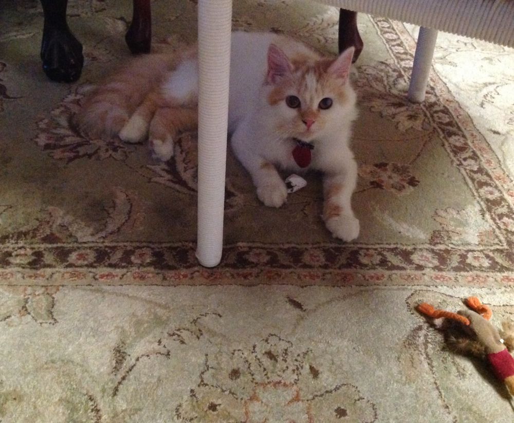 4/30/2020,周四,第三天。早晨去小猫房,在不同的地方看见玩具,看来昨晚Sally自己玩了玩具。我把小猫房门开着,门口拦着门柵,让Sally 习惯外面的声音。Sally 对外面很好奇。我然后把门柵打开一点,让Sally 自己可以进出,Sally开始一步一步的探险到客厅,紧张又期待,害怕又刺激。到了晚上Sally已经逛了全部房间了。喜欢房间暗暗的,它胆子就大一点到处跑。不让我碰,但是会到处跟着我。这之后,Sally 坚持一定要白天在主卧室睡觉,晚上睡在客厅,在客厅玩,在它的小卧室方便和看看窗外的世界,特别好奇其它关着门的房间,只要我一开门,它马上就溜进去视察一下。