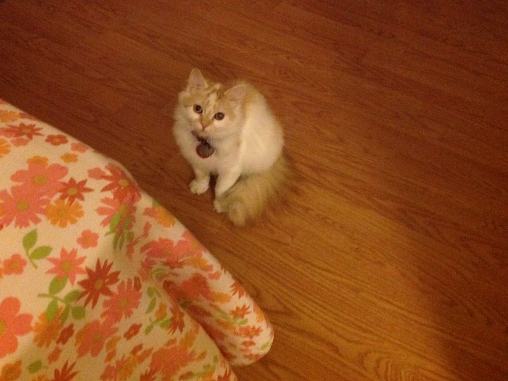 晚饭后,我坐在小猫房里干自己的事,Sally 静悄悄的躲在床下。Sally 颈上有个小铃铛,我根据小铃铛的声音判断它在哪里。刚过9点,Sally 悄悄地露出了头。它想吃了,猫粮在我身边的playpen 里,吃了猫粮,Sally 不再躲藏,始终与我保持两步远的距离,看着我。