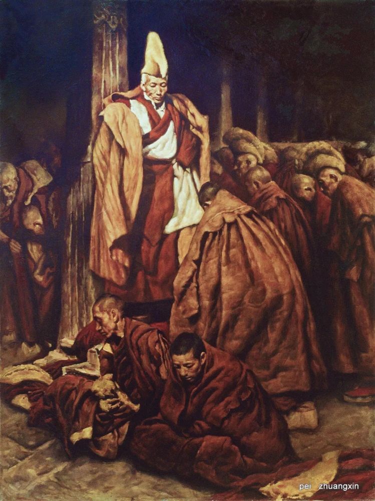 裴庄欣:这题目下的作品真还不少,西藏的文化历史离不开神性和宗教。遗憾在那里工作时的一段岁月里 ,宗教和一切相关内容曾经被认为反动而被彻底打倒。我不是职业宗教画家,也从未敢宣称或暗示自己有宗教信仰。特定历史时期的经历,使我看到雪域的灾难和几近毁灭,也见证了它的缓慢复苏和今天的辉煌。我无法区分宗教和人文情怀的差异,但明白没有必要抛弃自己的经历,去换取其它我根本就不怎么认同,也不属于自己的文化或信仰。