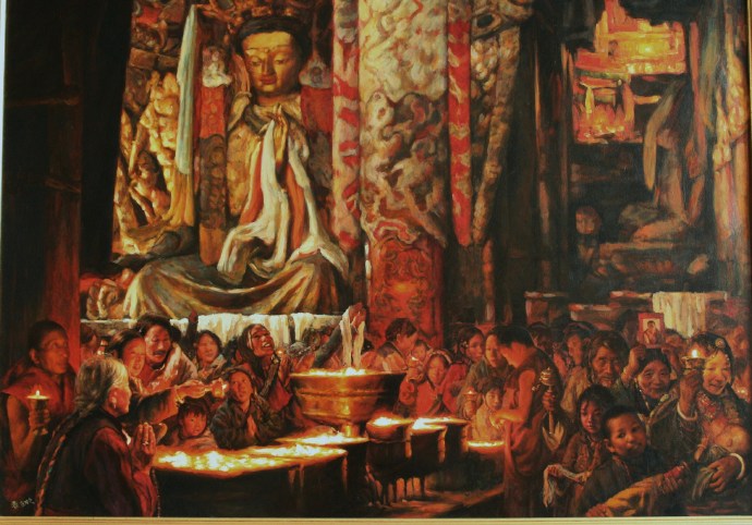 在这幅《燃灯节》中,准备祭祀节日的喇嘛们身着暗红色的袈裟,巨大的明黄色巨伞占据了一半画面,而人物依然在灯光的照耀下成为中心,人物身旁是作为俗世生活场景的拉萨街道,远处的布达拉宫以红白二色的造型成为第二层焦点。象征以宗教的信仰者为中心的神圣修行是他们生活的主要方式。