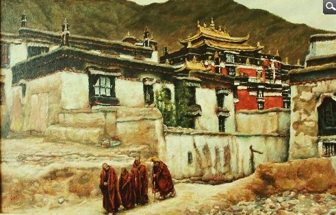 《扎什伦布寺》左边明亮跳跃的颜色,令人看到西藏的太阳的灼热;中间寺庙的金顶红墙成为画面的中心,僧人暗红色的袈裟和金色帽子在白褐色院墙和道路的映衬下,成为注视的焦点。四个不同年龄的僧人正在下山,修行是西藏生活的常态。出家人成为信仰的凡间符号。意味着佛教令人亲近而没有距离。