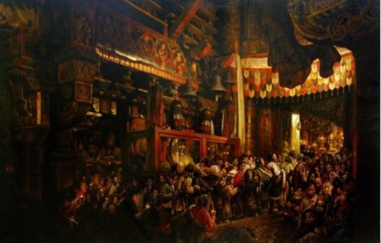 在这幅恢弘的巨制面前,宗教场所的庄严盛大在彩绘重檐,帷幔层叠的铺陈中昭示着信仰的神圣荣光。而那其中人头蜂拥的信众带着虔诚的微笑和渴望的眼神有秩序地排队前往心中的殿堂,不禁想到那些在大昭寺门前叩等身长头的信徒,坚毅卓绝堪称人生勇士。有什么样的虔诚才能放弃俗世的诱惑和纷扰,弃绝物质和享乐,踏上精神修行的觉悟之途?画面用光堪称独特,酥油灯的漫射光使整体画面具有了西方古典传统的典雅和高贵。局部放大后每一个细节都令人惊叹,每一个人物都在脸上透露出喜悦的光辉。我们没有在画面上看到高僧,但通过平稳蜂拥的排队信徒,已经可以窥见节日的神圣和加持的隆重了。