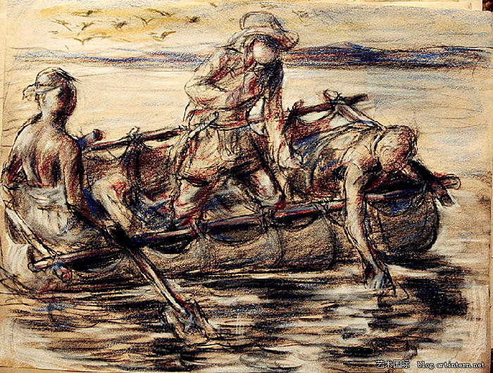 《袈裟》一画要早些,同出一辙的风格,严谨得让人不免忍俊,但画面背后的严肃认真很容易让观众打住笑声。叙述什么,观众可以想很宽,根据自己的宗教情结和理解联想。我自己对西藏文化几乎一无所知,对西藏宗教更是陌生,只觉得画面透着虔诚,待看了又陆续发过来的一些草图,素描稿,写生图,我就真的为画家高兴了。怎么说?那是些要让人击节歌咏或怅然长吁的“草图”,简单得几根线条而已,画家随意随心随性随兴点化的“草图”,自然轻松的流露,又有款款叙来的故事,不在乎有没有人在看或听,差不多是意识流一般的释放。咋说?似乎要比前面的所谓正规作品、所谓已完成作品要“好”多少倍!忍不住想说的是,那些完成的油画是作品,而后面寄来的“草图”是艺术,是画家真实内心的自然显现。作品可能用正规的审美、格局打动观众视觉,但“草图”的简约和直截了当可以打动心灵。不信让小孩子看看。