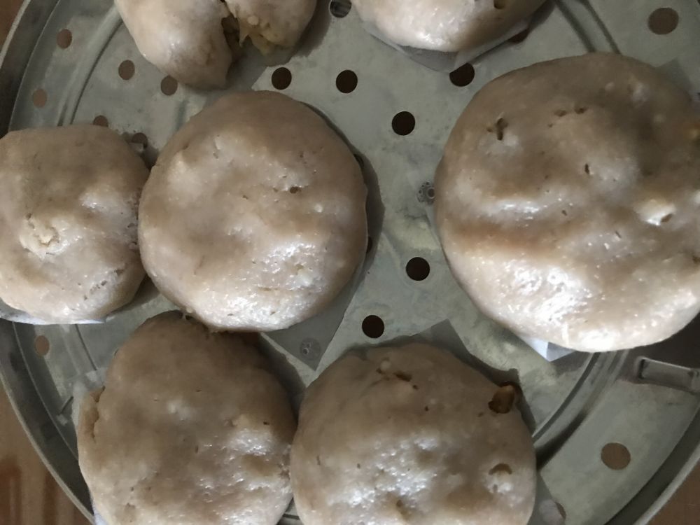 买了芋头回来才想起没空做芋头烧肉,那就试着做芋头蒸包吧,馅儿用了猪肉碎,香菇丁,豆干,虾米和萝卜干,味道还行,芋头蒸熟后加水和地瓜粉搓成团,包好上锅蒸熟。