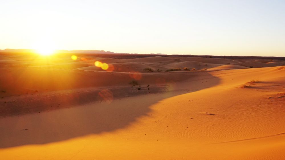 撒哈拉沙漠的日出文字实难描述。经历了沙漠的黑暗,再看到太阳徐徐升起,仿佛天都敞开了,阳光一下射向大地,如带来无限的生机和活力。沉寂中的晨光似乎更有聚集力,更有能量,可唤醒万物,穿透宇宙,让我兴奋、激动,无以言表。