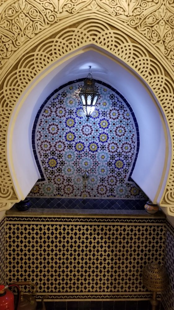 门内的景致,更加不可思议。在如此密集拥挤的老城中,居然藏着这么安静、优雅的民宿。嘈杂声、异味,甚至肮脏,统统被那扇漂亮的门挡在外面,真是古今两重天。这是一所非常讲究的房子,不大的厅房,有个天井,一眼望到天,好像比街上看到的天更蓝,更亮。夜间天井上的盖子会拉上,以保温防雨。三层楼房,除第一层外,每层有两间客房。房间舒适、干净,设施基本现代化。地面和墙壁是马赛克,瓷砖组成的各种图案。房内的装饰、色彩、摆设,处处透着精细。石膏雕刻的装潢格外有分量,这种工艺的刚劲儿,巧妙地藏在柔美的图案中,突显出它的魅力。这房子无处不是在展示他们的历史和文化艺术,让人目不暇接。无论眼光停留在哪个角落,都不舍得一晃而过。