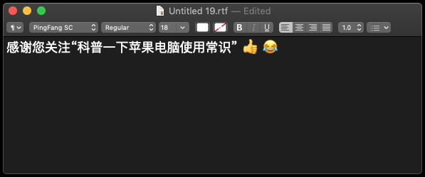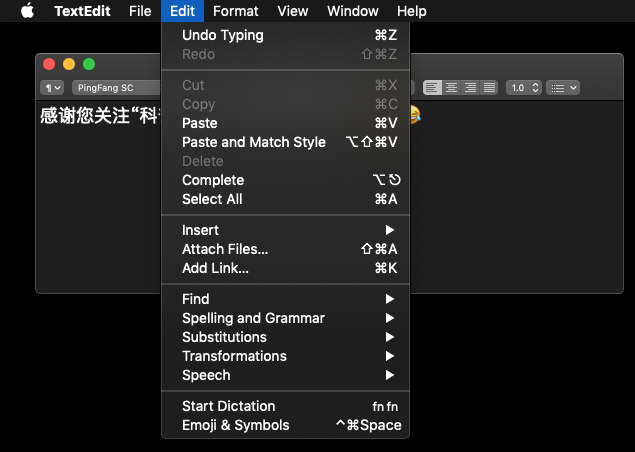孩子们没有不喜欢这个功能的。以刚才的TextEdit文本编辑器为例,当它成为当前活动窗口时(活动窗口的左上角三个圆点是彩色的,红黄绿),点击菜单项“Edit”,然后选择列表最后一行的“Emoji & Symbols”: