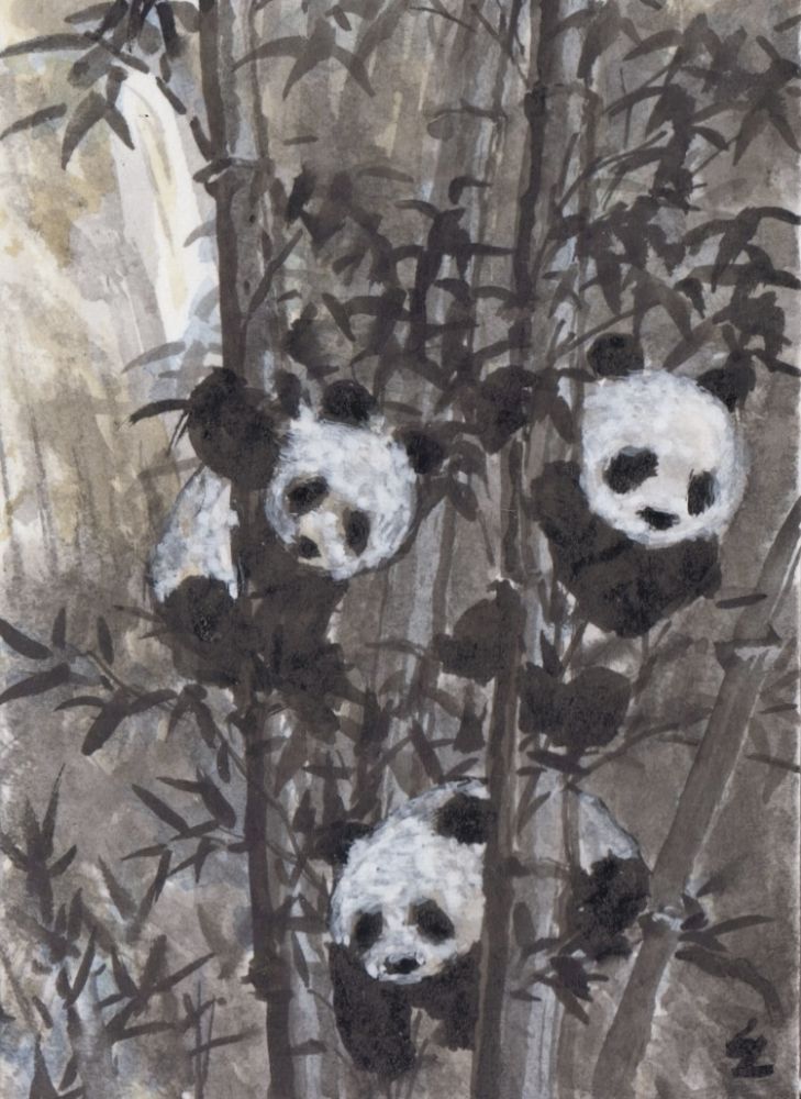 八只熊猫悠然居, 翠竹纷披绽翠珠。 一啃柔韧纤...