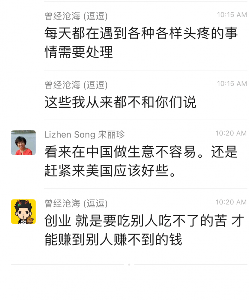 回国的创业之路确实不容易,他从小离开中国,几乎是在美国长大,对国内的环境的了解几乎是个空白,而且在美国长大的孩子是更不会利用关系,在没有任何基础的情况下走过了14年,目前他自己创办的公司已经初具规模,在深圳和北京有实体店和网店,将近20个人的团队,真为他感到自豪,他为了事业舍去了太多,也付出了太多也得到了相应的收获,踏入了他实现梦想的门框,我应该为他而骄傲。期待疫情过了再相见。