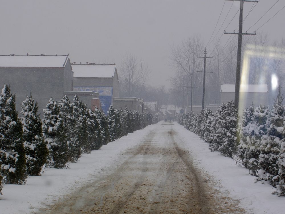 刚刚下过一场大雪,空气清新,大地清朗,大家心情很好。银庄距白集镇一二华里,出镇东行,然后南拐。一条新修的柏油路,南北横卧连接着乡村公路和银庄。道路两边栽种整齐的小柏树塔立着,很像列队的哨兵。这是“六个一工程”新修的道路,笔直进村。