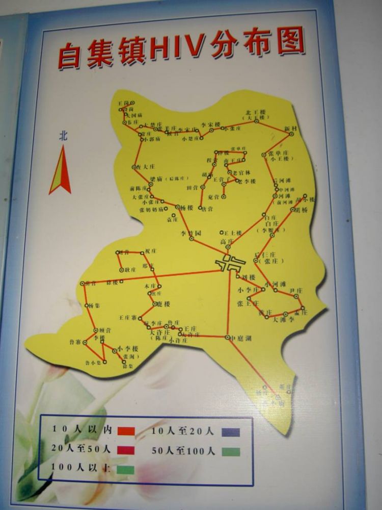 白集镇卫生院办公室的墙壁上一张艾滋病疫情分布图,标示出疫情已经波及全镇所有村庄。