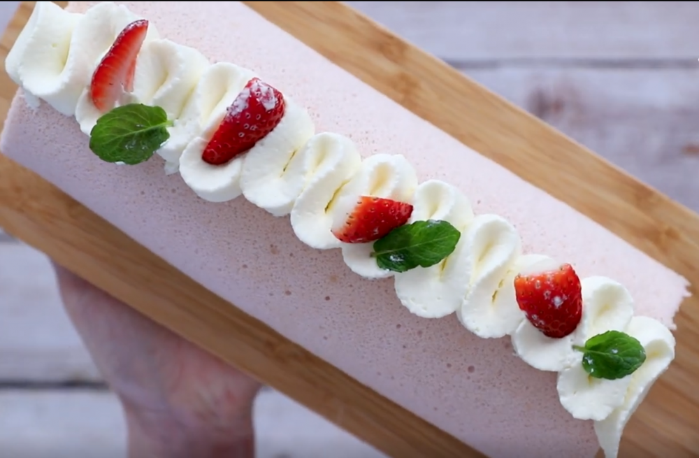 这款粉粉嫩嫩,口感清甜松软的草莓蛋糕卷,蛋糕里加入了草莓果泥,颜色上非常讨人喜欢,口味上也变得更清爽。再配上简单的缎带奶油造型,颜值超高。