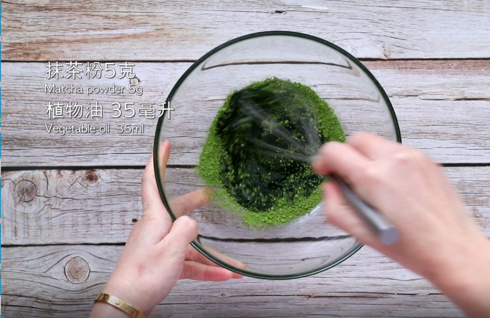 要想蛋黄糊没有颗粒, 可以先将油和抹茶粉混合,因为抹茶粉可以更好地溶于油之中,所以因为再添加温热牛奶