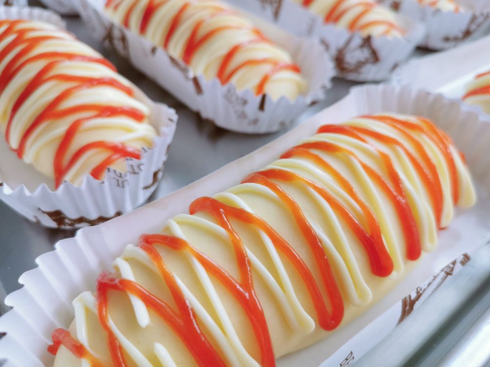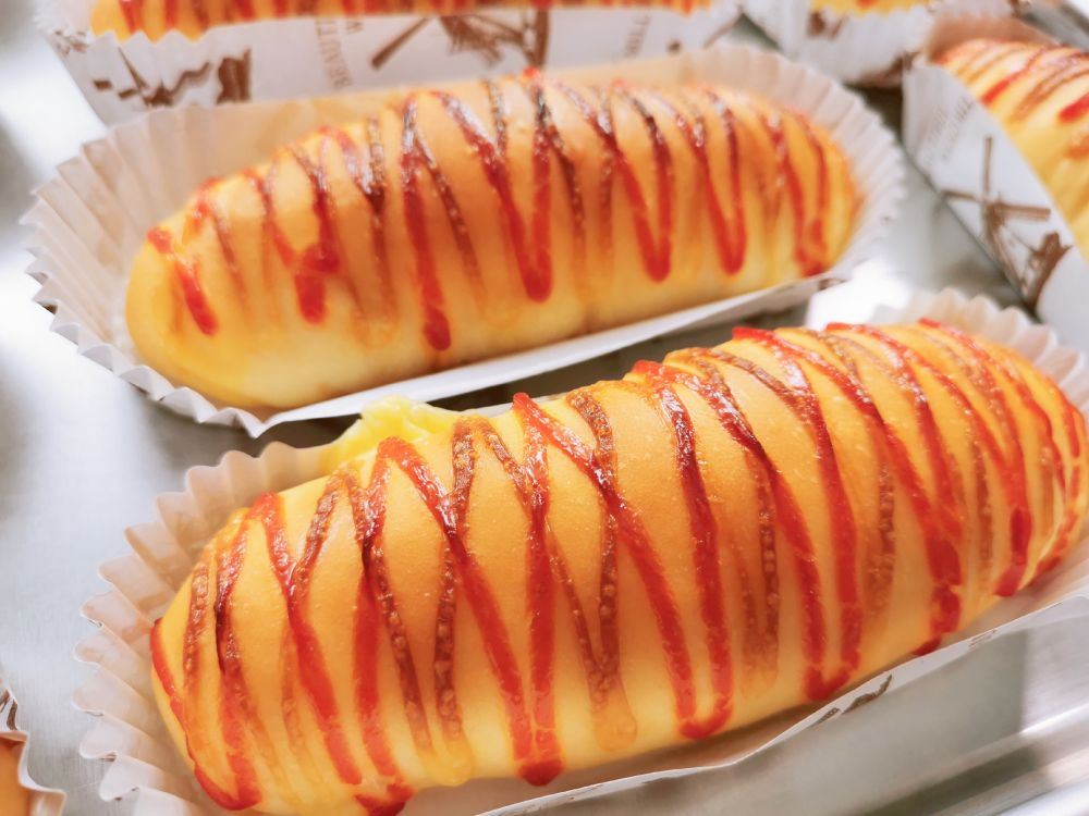 表面挤上日式美乃滋酱和番茄酱,不仅好看也让面包更加可口。