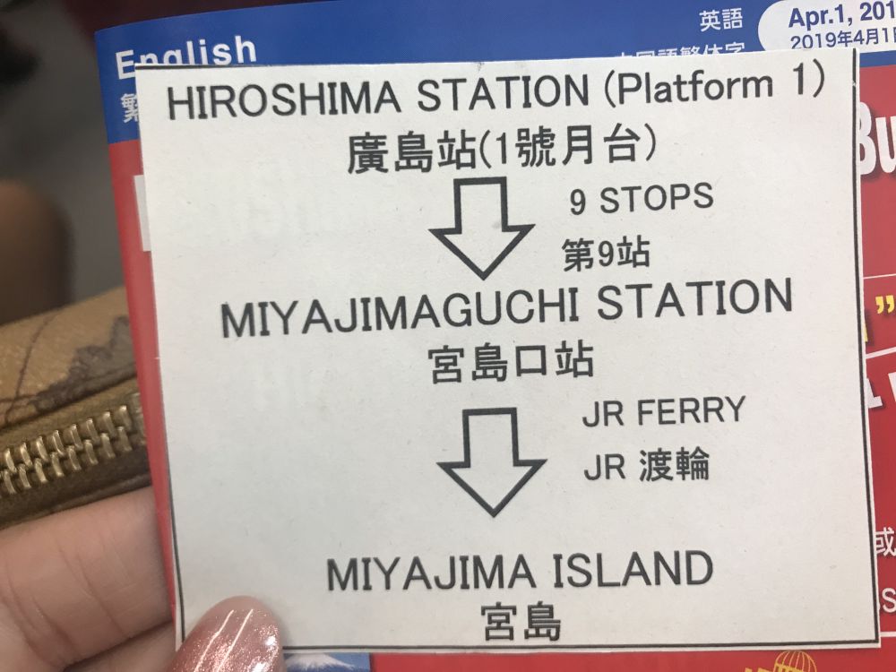 在换JR Pass的时候,会有讲中文的工作人员,听说我们要去宫岛,马上拿出一份换乘说明递给我。根据上面的说明,很容易就换乘电车然后坐渡轮到了宫岛。我们的第一站!