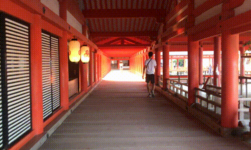 不知在哪里一转弯,眼前就看到一个颜色艳丽的五重塔。走路不过几分钟就是严岛神社了,神社门口的售票处里的和尚(穿着道服,也不知道算不算和尚),一直吹着笛子,在晨曦中,伴着笛声,走入严岛神社恍惚间有种步入另外一个世界的感觉。