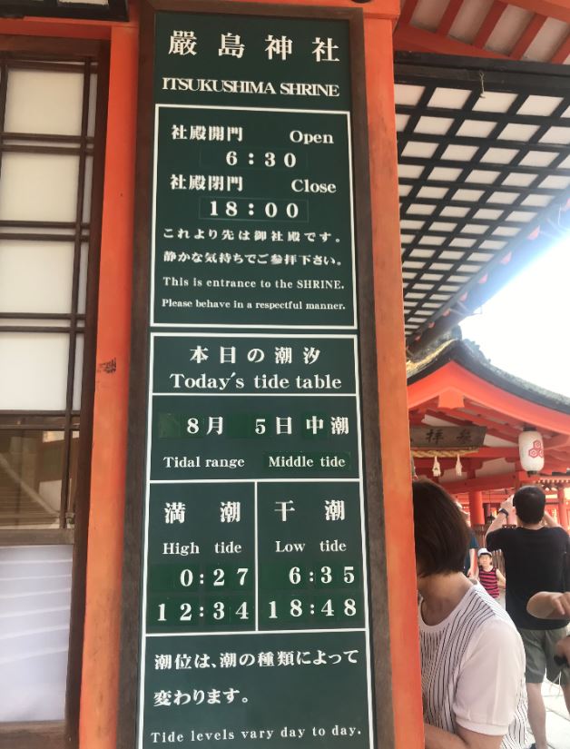 在神社门口挂着当天的潮起潮落时间表。