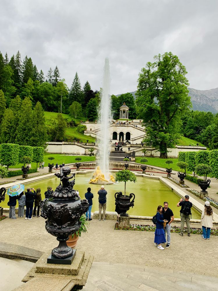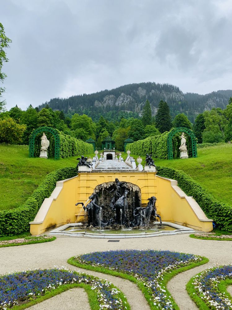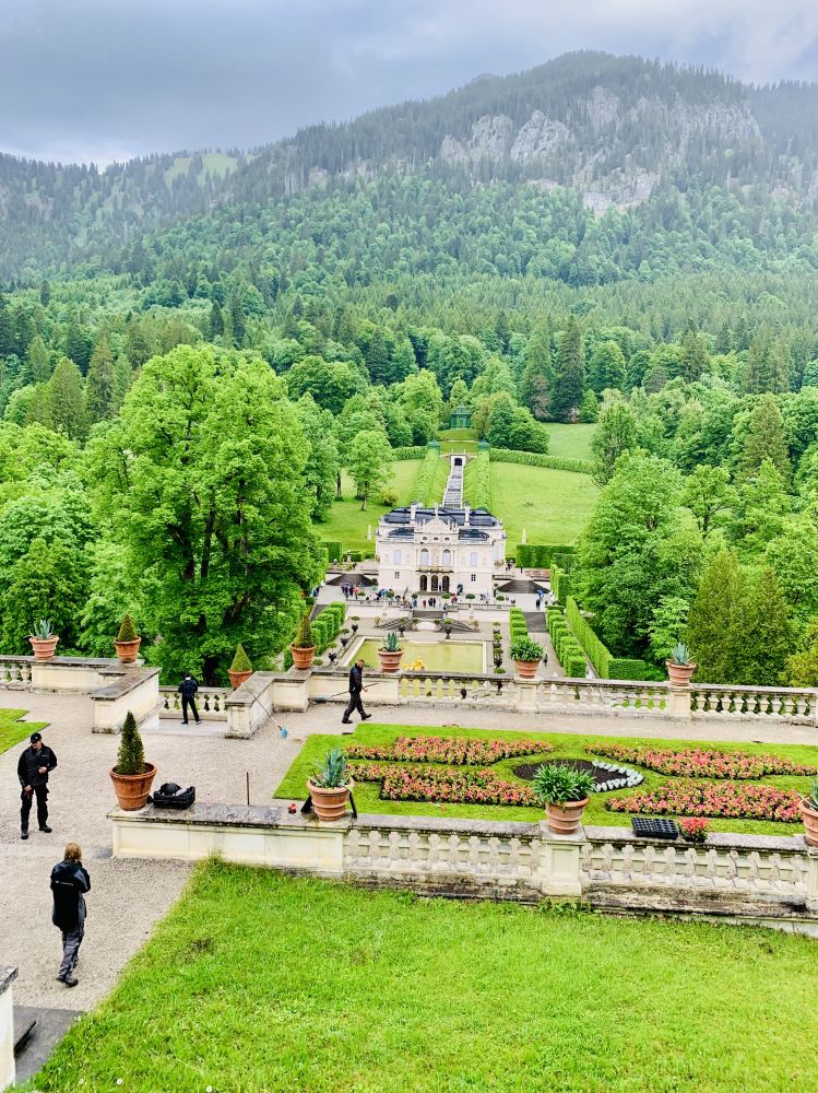 如果说新天鹅堡是座建立在山坡上拔地而起的宏伟城堡,林德霍夫宫就像是深藏于山中的一处世外桃园。车到了停车场你还完全没有感觉到这座美丽的宫殿的存在。下车之后步行不过数十米,当你转个弯绕过山坡顿时霍然开朗。