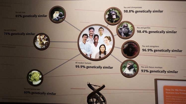 和黑猩猩的基因有98.9%的相似,和老鼠的基因有85%,家禽的基因有75%,甚至和香蕉都有60%的相似!