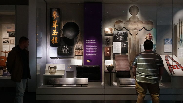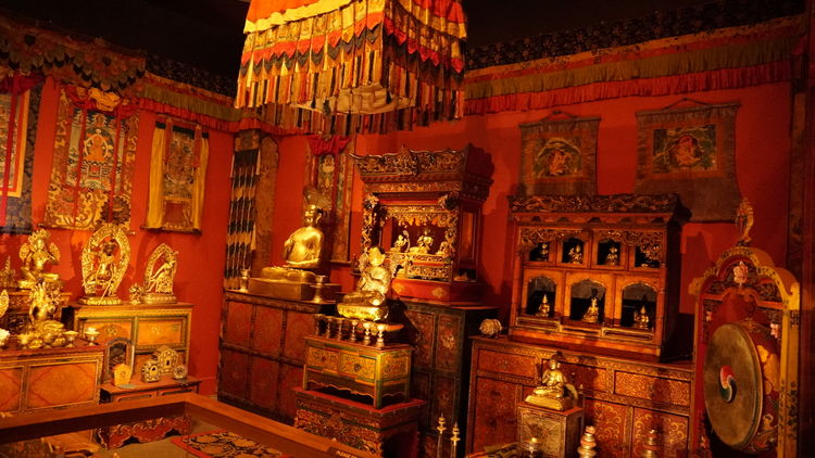 亚洲艺术博物馆里的西藏佛教神社展厅。这展厅非常暗,里面放着佛教的音乐,大大小小的金佛像,佛龛,房间门口一边一把椅子。有人坐在那里冥思。