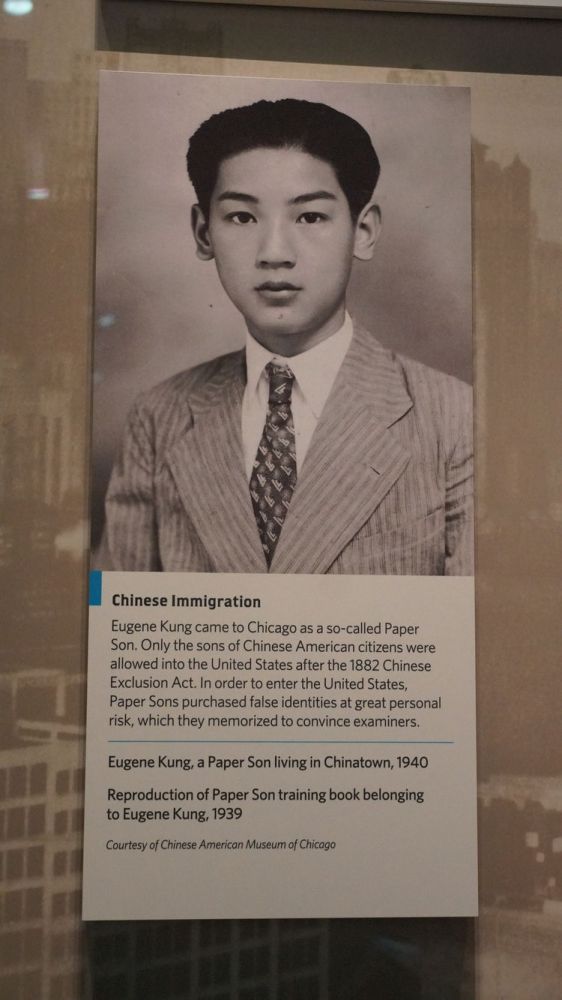 照片中的男子是个“纸面上的儿子”。那个时候因为排华法案,只有美籍华人的亲生儿女才可以移民美国,于是很多人花钱买了假文件来证明他们的父母是美籍华人。于是有了这个“纸面上的儿子、女儿(paper sons and daughters)”的术语。