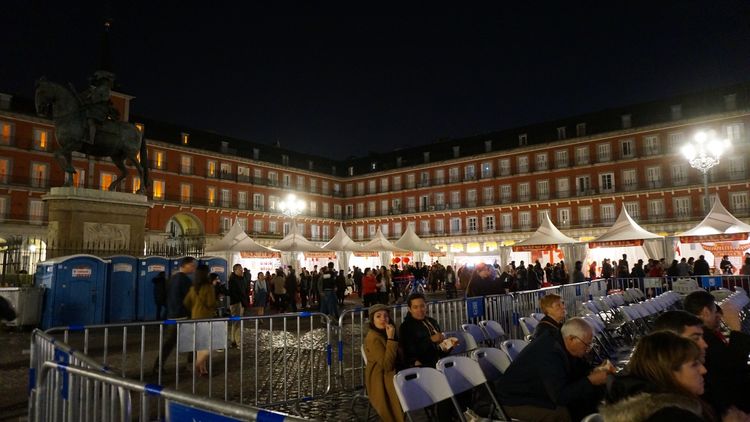 在马德里第一天(2019.2.24)的晚上我们就去这个有名的大广场了,可惜广场上临时搭了好几排白色的蓬帐,还有好些移动式厕所。