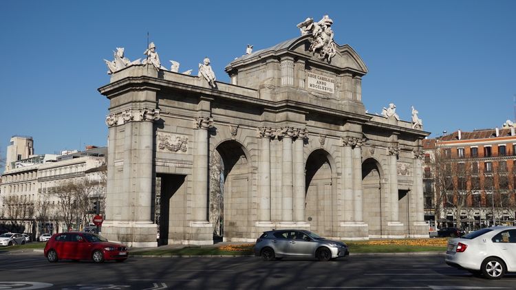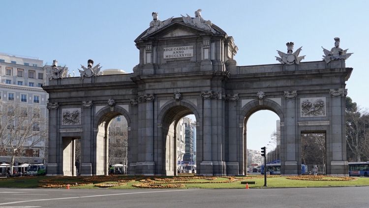 独立广场中心是1778年兴建的阿尔卡拉凯旋门 (Puerta de Alcalá)。比1806年开始建的巴黎凯旋门还要早。
