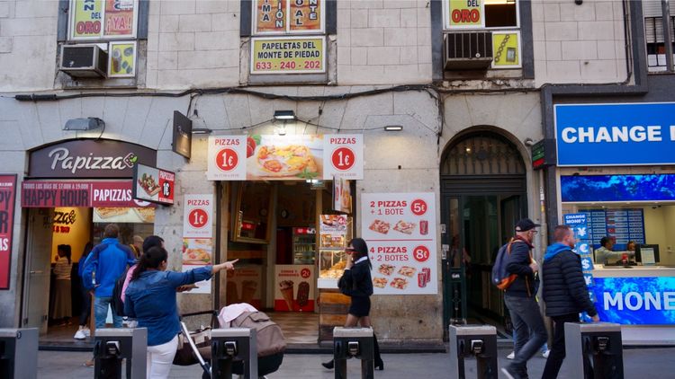 在西班牙到处都可以看到这样的小店。1€一块披萨。没有买过,不知道好不好吃,只知道便宜。