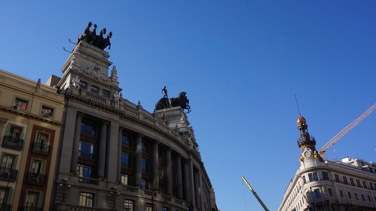 早上的西班牙广场有点苍白,雕像后面的大楼 Edificio España 在装修,楼前的帷幕是一个巨大的华为广告。说老实话:不好看。