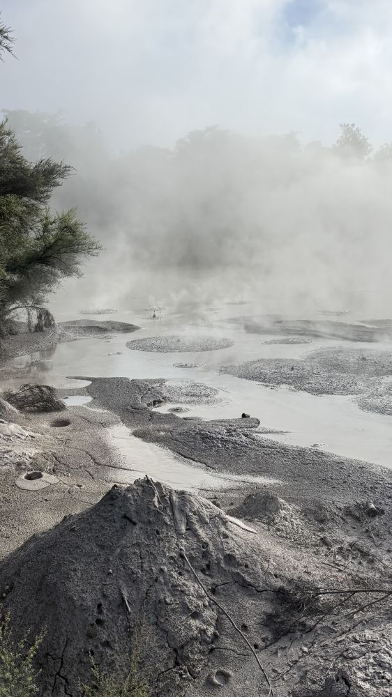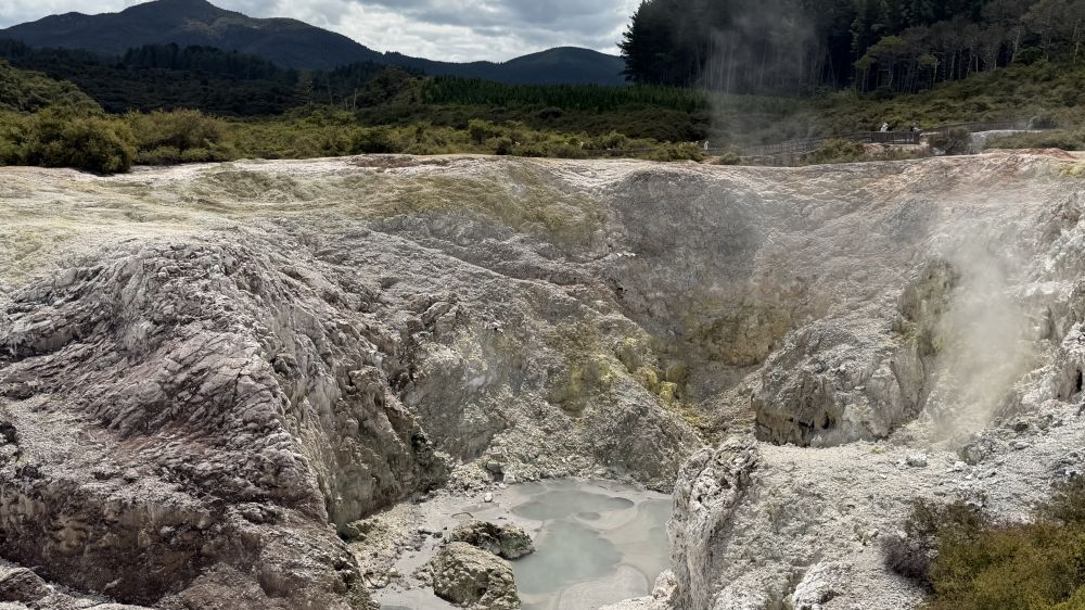 上面是可以免费看的怀奥塔普泥浆池(Waiotapu Mud Pool)。泥潭里到处都冒着气泡。咕嘟咕嘟好像慢烧锅。