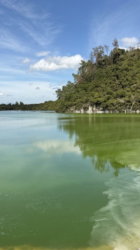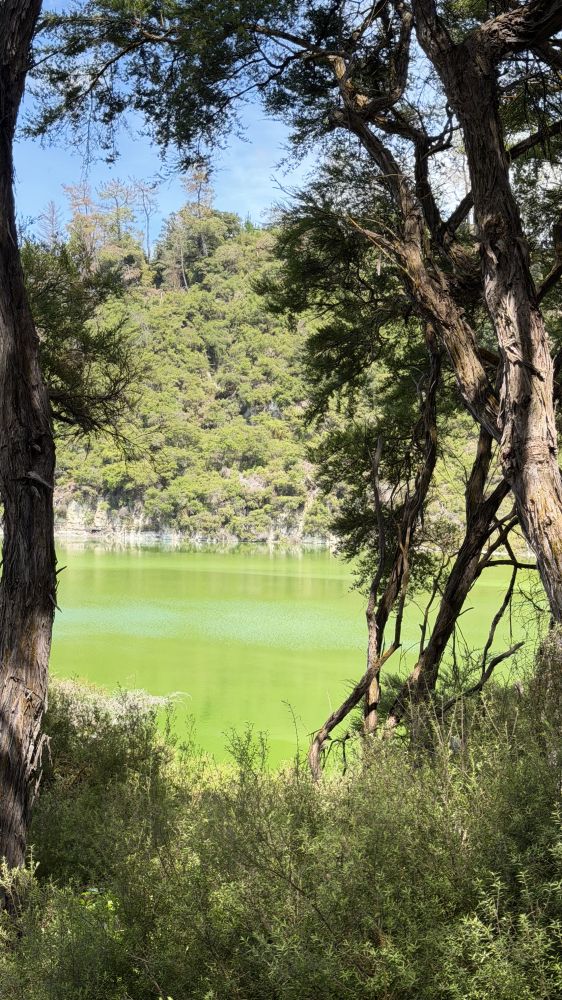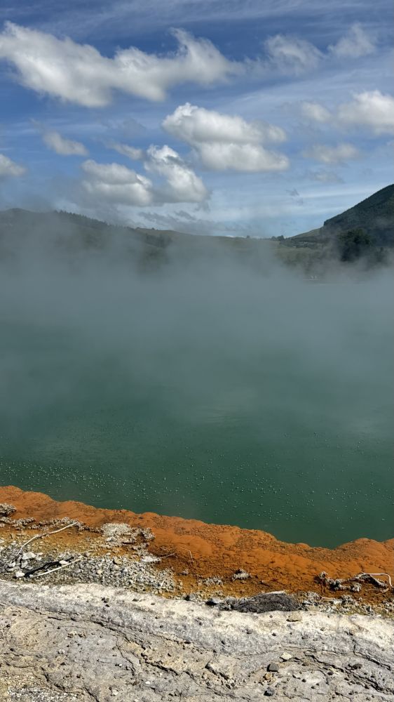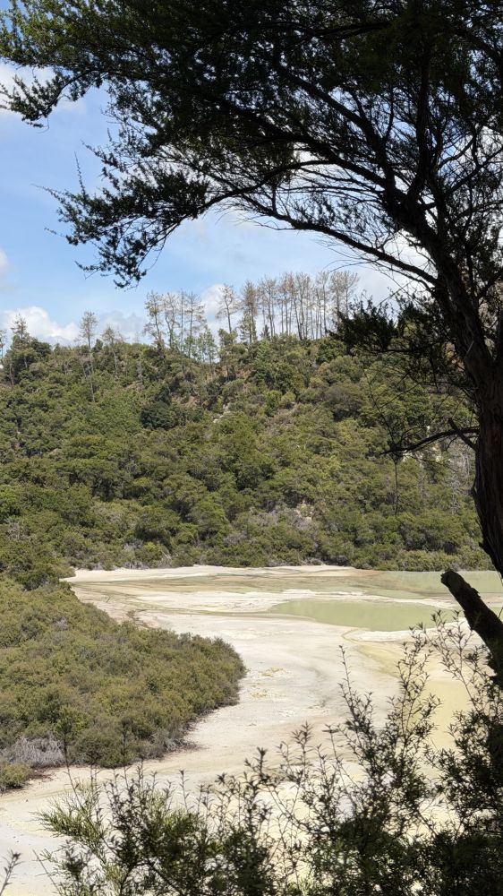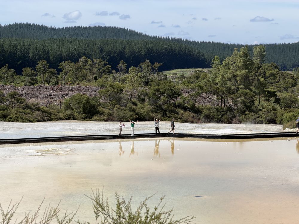 于是我们开车几分钟把车停到另一个停车场,坐在看台上等待。天气炎热,阳光强烈,无遮无挡,非常不舒服。结果所谓的表演就是一个毛利妇人讲了几分钟大概是的毛利传说,我猜的,因为声音小得根本听不清楚。然后她带着大家喊了几个毛利语的单词。一个老头拿着纸袋走过来,把里面的东西到在一个好像堆起来的小炉子里,然后这个“诺克斯夫人间歇泉”便开始喷发。那个毛利妇女开始吟唱。间歇由小渐大,由低到高。几分钟便结束了。特别不喜欢这种人为控制喷发的表演。