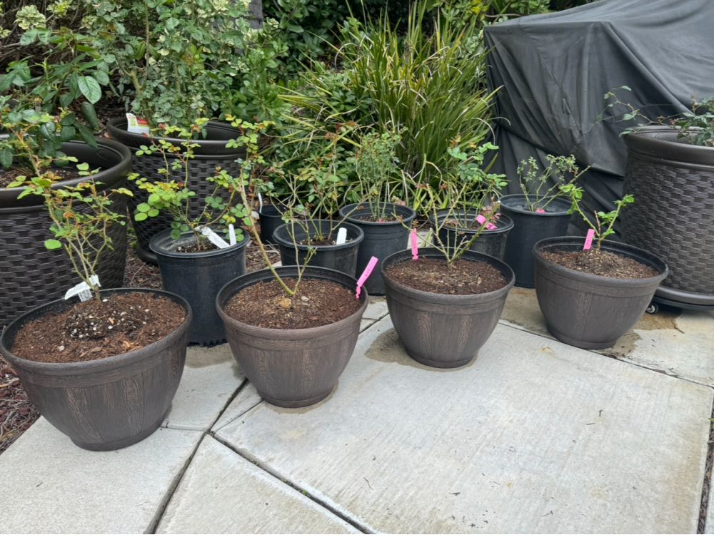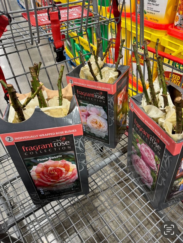 今年迷上种月季,一月份在DA网上下了二单,这两天网上看到HD和Lowe's 已经有裸根苗了,赶紧去了附近的五六个店去买,到那儿一看,其实那里的裸树苗已经来了一个多月了,他们的苗种在一个盒子里,每棵苗上面都发出了红红绿绿的叶子,挑喜欢的品种买了几棵回家,我们家后院可以种东西的地方几乎没有,所以不能啥都搬回来,现有的连小苗在内有二十多棵,除了四棵地载,其他都得种在盆里了。