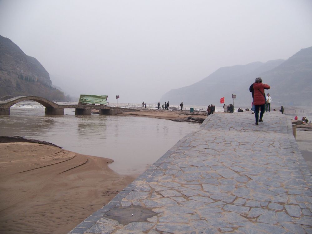 不久,大巴停在离瀑布不远的“壶口瀑布广场”。我们鱼贯下车,经过广场大门,走过高高低低的石头河滩,直奔主题。