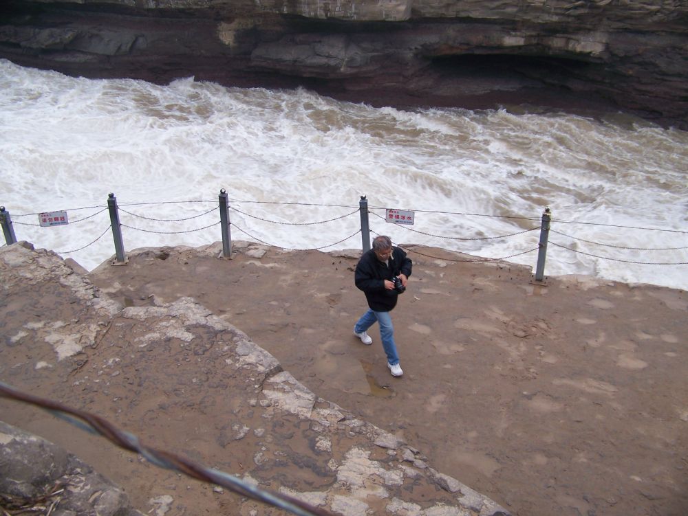 站在久负盛名的瀑布边,我凭栏向左手的上游望去,只见,淡黄色的江水,从两岸群山之间三百多米宽的河床中懒懒地、平静地流向壶状崖口。骤然,坠入我脚下上宽下窄的悬崖,掀起巨大的白色浪花,翻腾倾涌地向着湾曲的河道一泻而下,其声势如同在巨大无比的壶中倾出,使人震撼。轻易不激动的老公此时手里拿着相机也忘记了咔嚓,禁不住朗声诵起:“君不见,黄河之水天上来,奔腾到海不复回,,,,,,”。我也顾不得抹去扑面而来的水雾,像个小姑娘,不免俗套地对着奔腾的黄河大喊:“黄河,,,,,,,”,心情久久不能平静。