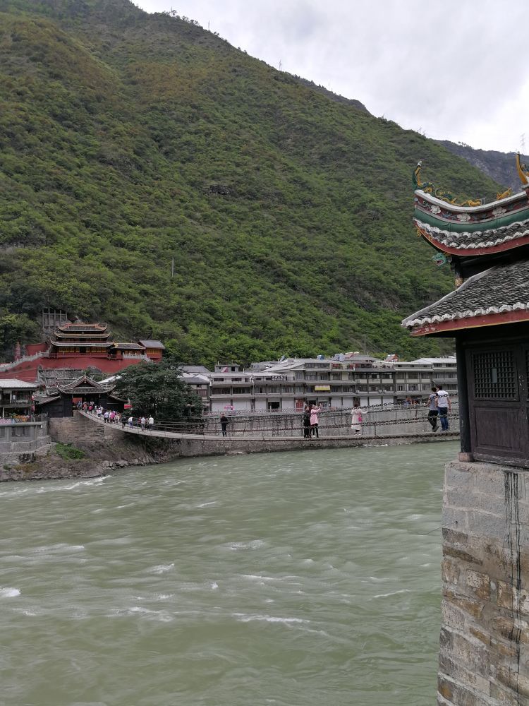 大约长100余米,宽3米,离水面有好几丈深的泸定桥,架设在水流遄急的大渡河上。桥的两边各有2根铁链做扶手,9根铁链组成U形桥面,桥面上铺着窄窄的木板。我走在有点摇晃,且留有缝隙的木板桥面上,带着水汽的河风呼呼地迎面吹来,感觉阵阵凉意,加上波涛汹涌的大渡河水从上游直泻而下,撞击在两岸的岩石上,溅起高高的浪花,震耳欲聋,我有点害怕,赶紧停下脚步扶住栏杆不敢移动半步。站在桥头指挥行人的一位老汉见我久久站在那里,朝着我挥手大喊:“快走!快走啊!”我只好慢慢地步向对岸。