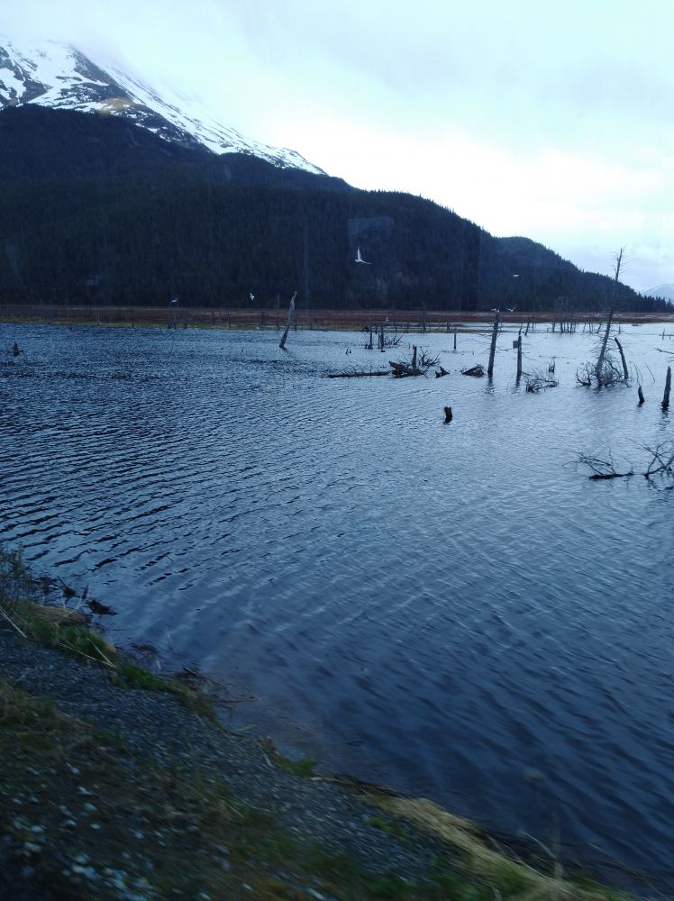 阿拉斯加铁道是紧贴着Seward 高速公路,沿着海岸线修筑的。这条铁道不但是一条淘金时代的运输大动脉,也是如今一条重要的旅游热线。它沿途经过大海、雪山、湿地,还有草原,风景绝佳。我们在途中,还用望远镜,在一处雪山的半腰上看到好几只野羊。靠海的车窗那边,有乘客还抓拍到了游动的鲸鱼。