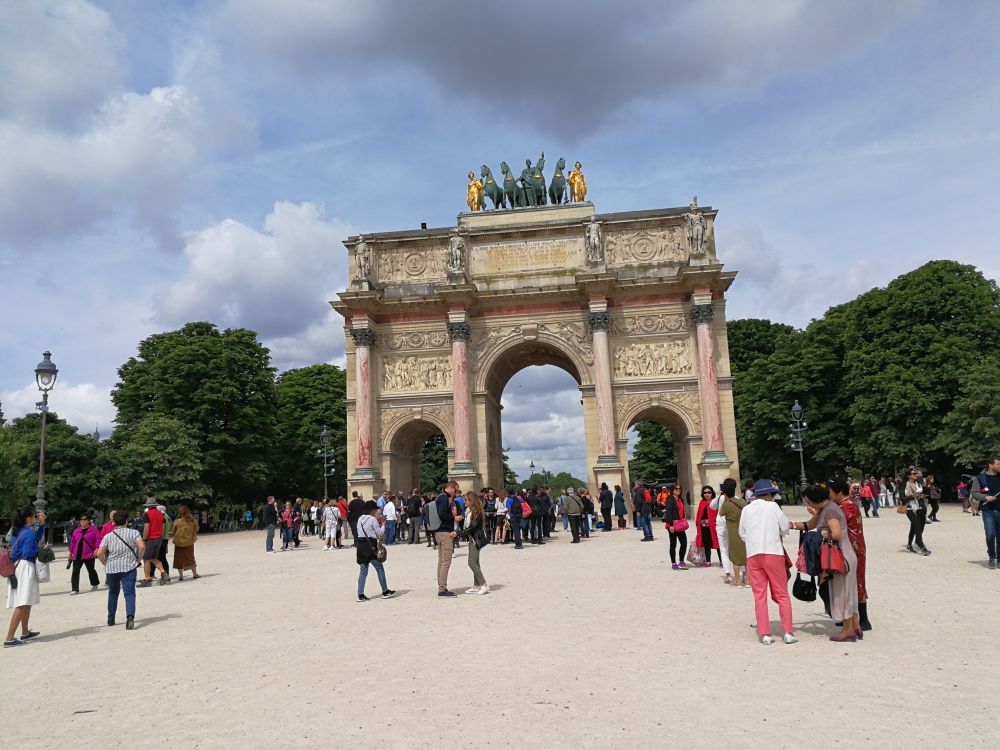 协和广场对面有一座小凯旋门,是为庆祝拿破仑1805年的一系列胜利而建造的。它的红、白大理石圆柱之间是三个圆拱门,拱门上方布满了纪念拿破仑战绩的淡浮雕。门的顶端摆放了四匹从意大利圣马可教堂搬来的镀金奔马,原物已于1915年还给了意大利。