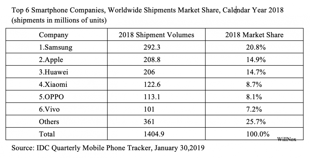 2018年全球销量前6的手机为三星,苹果,华为,小米,OPPO和Vivo(三星实际上是美国控股公司,败走中国市场,但美国市场禁了华为)。4个国产品牌占全球38.7%的市场份额。(中国手机市场占世界的30%,4大国产手机占国内市场的78%)