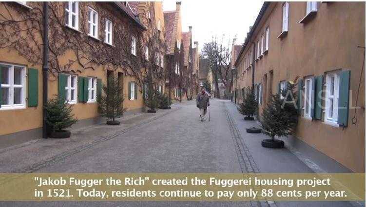1516年富格尔花了440 Guilder 买下一块地,加上郊区的2500平方米的土地,建造了一个供身体残疾或缺衣少食,但勤奋工作的奥格斯堡民居住。到1523年扩建到52套,在45-65平米之间包括厨房客厅卧室以及一个小备用房间,这便是所说的“富格尔之家”(Fuggerei),世界上最古老的福利社区,最早的廉租房,第一批搬入“富格尔之家”的人每年只需付1 Guilder的租金,相当于如今的0.88欧元,差不多1美元,7元人民币左右。