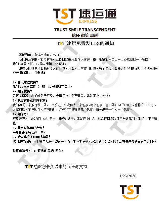 有非常nice的华人快递公司 说只要是口罩运费全免