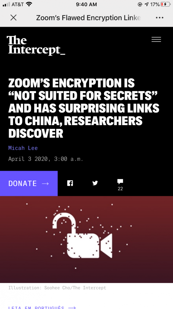 “The Intercept”文章的标题是,“研究人员发现, ZOOM的加密技术不适合于机密事情,而且此公司与中国有惊人的连接。”