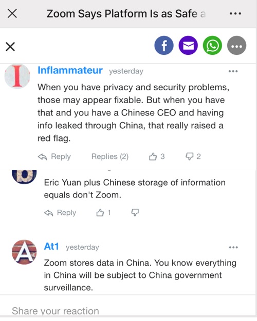 看看媒体报道后面的读者留言,几乎一面倒,以中国元素为借口,给ZOOM以负面的评论 。