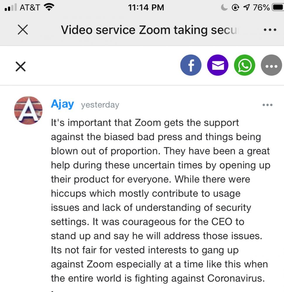 中文翻译是:重要的是,Zoom必须获得支持,以防止偏见的不良新闻和夸大其词的报道。在现在动荡的时期,为所有人开放产品,ZOOM他们提供了极大的帮助。虽然出现一些问题,但这主要是使用问题和对安全设置的缺乏了解。CEO敢于站出来,并说他将解决这些问题,这是是勇敢的。既得利益集团打压Zoom是不公平的,尤其是在整个世界都在对抗冠状病毒的时候。