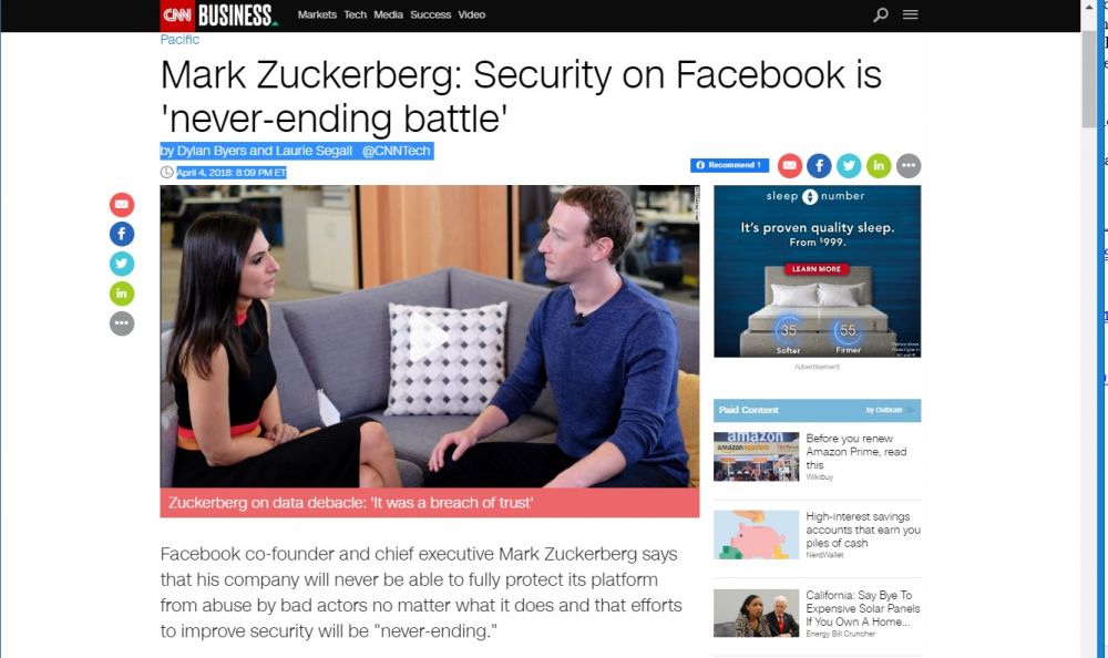 讲到网络安全,脸书的创始人兼CEO扎克伯格 (小扎)应该最有经验。他在采访中提到,脸书的安全问题是一个永恒的挑战。他的公司将永远无法完全保护其平台免受不良行为者的滥用,并且改善安全性的努力将“永无止境”。