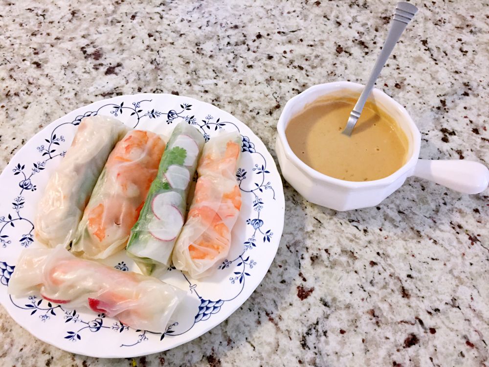 3. 用米皮把准备好的配料按照自己的喜欢组合,包好之后,蘸上酱料就可以吃了