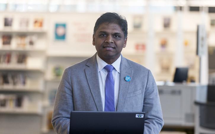 2020年4月6日星期一,在费尔菲尔德亨利科县公共图书馆举行的新闻发布会上,里士满和亨利科卫生区主任丹尼·阿武拉博士提供了当地的COVID-19最新消息。