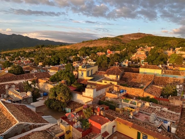 民宿的5欧元的早餐十分丰盛,提供了松软的面包,配有果酱黄油。火腿奶酪,咖啡牛奶果汁,两只煎鸡蛋,还有三色水果拼盘。这在食品限量供应的古巴的确难得,谢过民宿女主人,我们一起走在古城石路上,继续慢慢体会小镇的韵味。